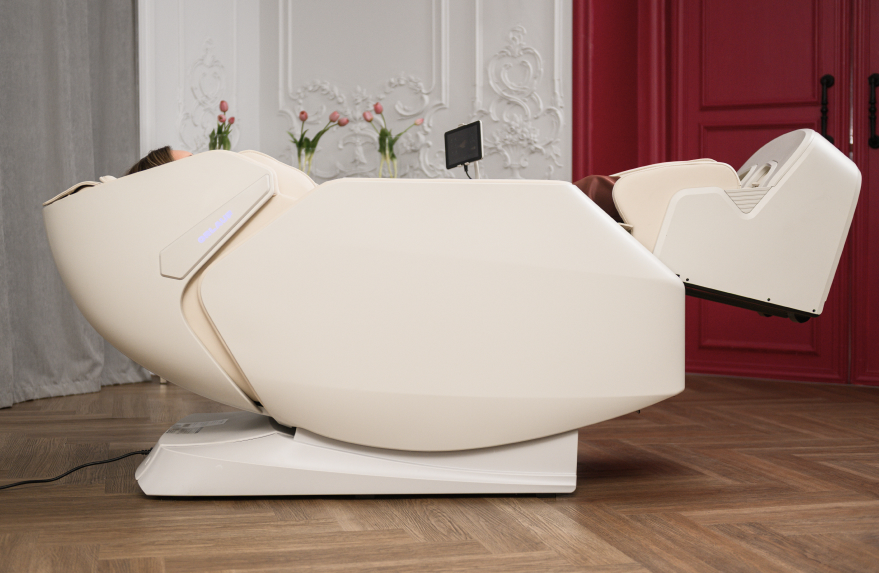 Soft lines, premium materials and two exquisite shades — Cashmere Sand and Umber Depths — they allow the chair to become a natural part of any space. Built-in speakers add the finishing touch: Your favorite music or nature sounds make every session truly atmospheric.