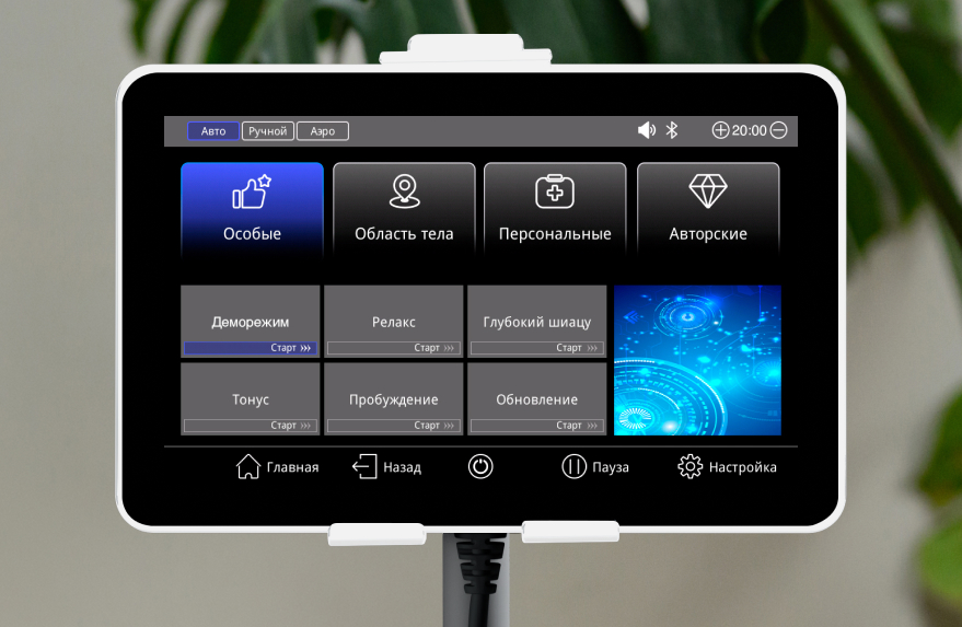 The engineers have thought of three control methods: a touchscreen tablet with a color screen and a Russified menu (navigate through clear icons), quick access buttons on the armrest — they allow you to adjust the settings without pausing in the massage, as well as voice control with an intelligent assistant. IntelliGuide™.