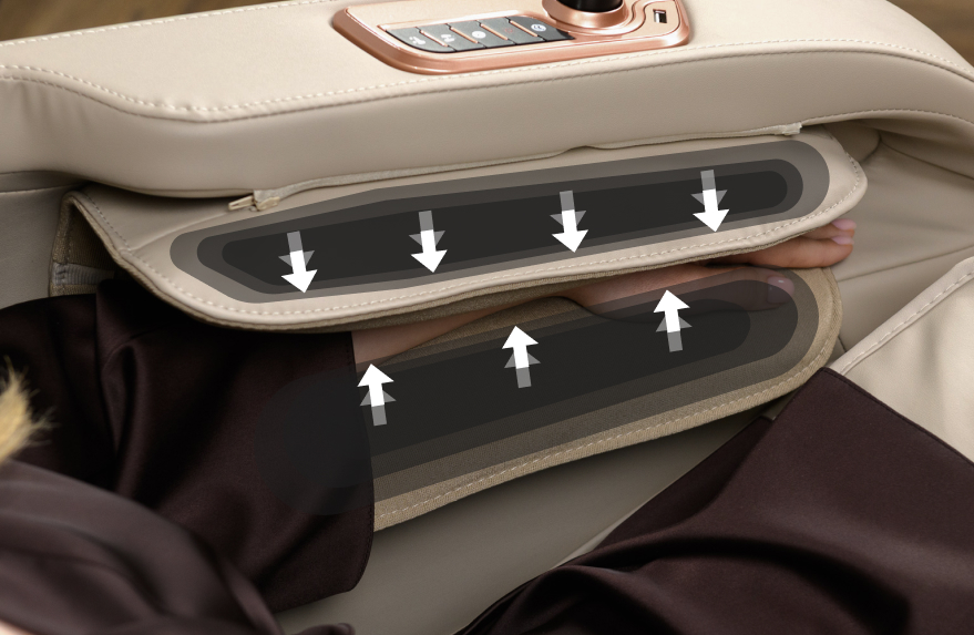 22 pillows provide air-compression massage, covering the body from head to toe. Two pillows gently work on the temples, helping to relax the facial muscles.