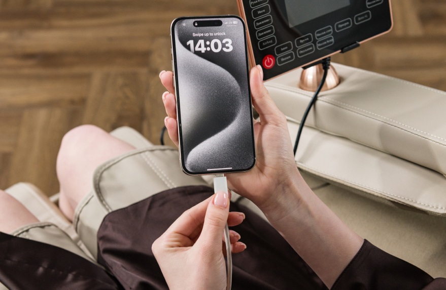 Intuitive operation via a tablet and a quick access system on the armrest makes it easy to adjust all massage parameters, including session time — 15, 20, 25 or 30 minutes.