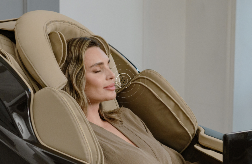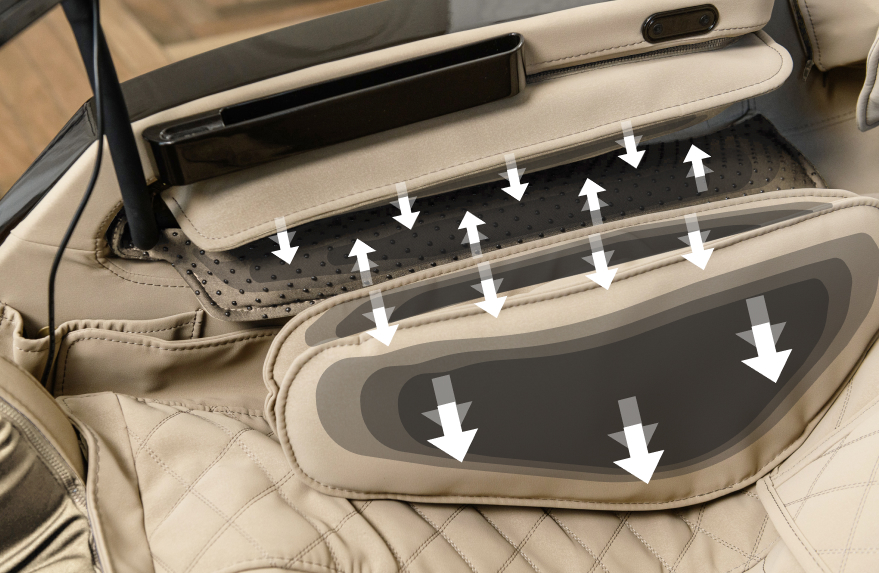 The pillow under the hips enhances the stretching effect and activates blood flow. A unique head massage system using air cushions gently affects the temples, promoting relaxation and stress relief.
